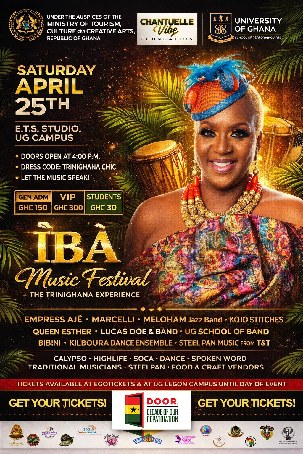 Scheduled for Saturday, April 25th at the ETS Studio on the University of Ghana campus, the festival is a collaborative effort between the Chantuelle Vibz Foundation of Trinidad and Tobago and the University of Ghana School of Performing Arts, under the auspices of the Ministry of Tourism, Culture and Creative Arts (Ghana). The event honours our ancestors, celebrates divine feminine energy, and highlights the deep cultural ties between Ghana and the Caribbean.